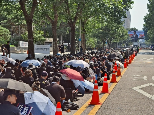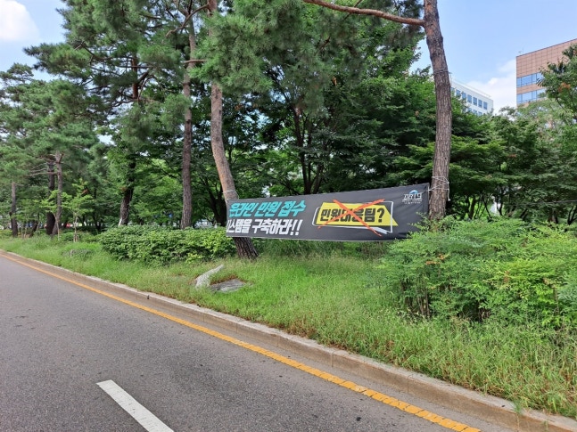 | ▲ <민원대응팀 아웃 온라인 민원접수시스템 구축하라> 펼침막 지난 5차 추모 집회 당시, 국회대로 변에 <민원대응팀 아웃 온라인 민원접수시스템 구축하라>는 펼침막이 내걸려 있는 광경. |