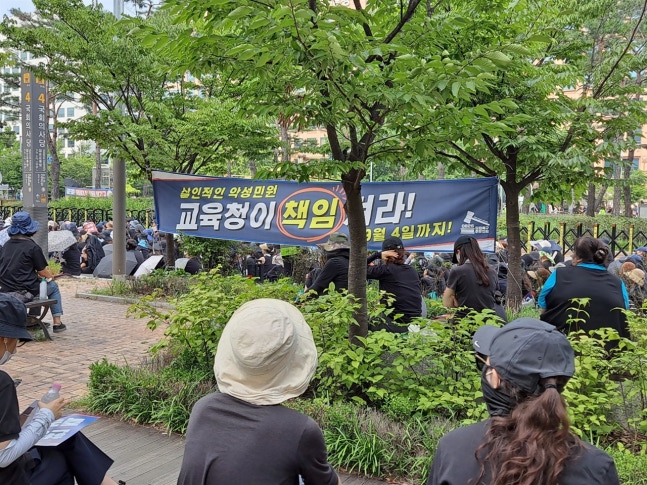 | ▲ <살인적인 악성 민원 교육청이 책임져라> 펼침막 제6차 국회대로 변에 <살인적인 악성 민원 교육청이 책임져라>는 펼침막이 내걸려 있다. 뜨거운 열기에도 아랑곳하지 않고 매주 전국에서 모인 교사들의 절절한 외침을 대변한다. |